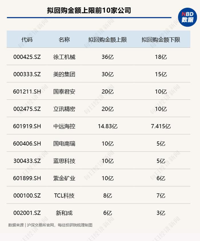 从拟回购金额来看,共有69家公司发布了拟回购金额上限,合计达264.63亿元。其中,徐工机械拟回购金额18亿-36亿元,居各公司榜首。美的集团次之,拟回购金额15亿-30亿元。